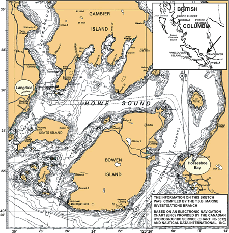 After rounding Finisterre Island at the north tip of Bowen Island, the Queen of Surrey contacted the Cates V on very high frequency (VHF) channel 72 and informed the skipper that the ferry would be steering on a southerly heading until five cables off Tyee Point. At that time, the crew would swing the vessel 180°, transfer controls to the No. 1 wheelhouse, and dock the vessel under its own power. The tug was requested to position itself north of the berth and well over to the east, close to the cliffs to keep clear, and to provide assistance only if asked to do so.