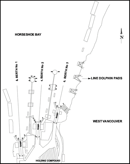 The Queen of Surrey secured starboard side to the No. 3 berth (see Figure 2) in what appeared to be a smooth docking; no impact was felt either during its approach to the berth or while docking. Upon arrival, and after consulting with the chief engineer, the master decided to retain the services of the tug for the next docking at Horseshoe Bay scheduled for 0900. On contacting the Cates V to relay this request, the tug skipper informed the ferry that the Cates V had sustained damage to its bridge windows and the wheelhouse, and that it would be necessary to order another tug.