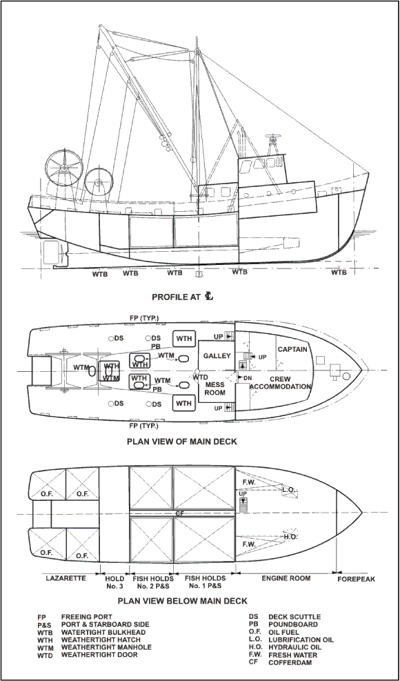 The Hope Bay was a small fishing vessel of closed construction, having an all-welded steel double-chine hull with a partly raised forecastle deck, a stern ramp and a skeg. The hull below the main deck was subdivided by five transverse watertight bulkheads, separating (from forward): the forepeak; engine room; two forward (No. 1 port and starboard) and two after (No. 2 port and starboard) insulated fish holds divided by a centre line cofferdam; a third hold (No. 3 hold) designated as a void space; and the lazarette, which housed the steering gear. Four diesel oil tanks were arranged on the port and starboard sides outboard of the lazarette. Fresh water storage tanks were located on the port and starboard sides of the engine room (see Figure 1).