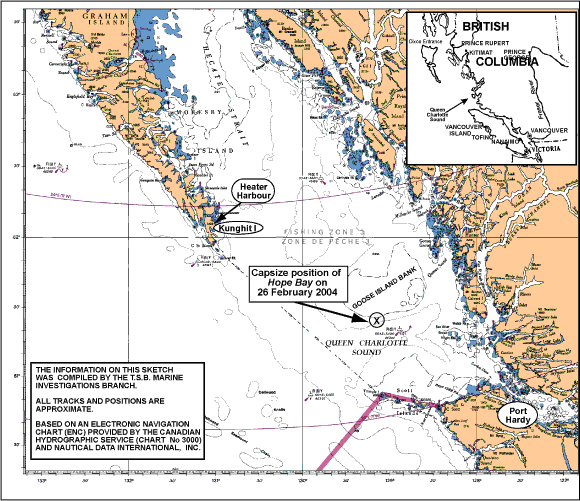 Shortly after midnight on 26 February 2004, while transiting Queen Charlotte Sound, British Columbia, the commercial fishing vessel Hope Bay listed suddenly to starboard and capsized. The four persons on board abandoned the vessel by jumping into the sea. Search and rescue personnel initially rescued one person and recovered the bodies of two others. The body of the fourth person was recovered later the same day. The vessel remained afloat for about 12 hours before sinking.