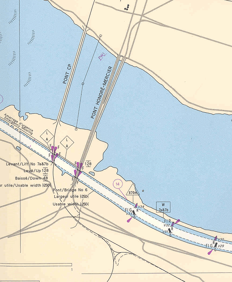 The Honoré-Mercier Bridge, which for Seaway users is identified as Bridge 6, is part of the highway that links Longueuil to Montréal (see Photo 1). The twin CPR bridges, located upstream from the Honoré-Mercier Bridge, are equipped with a lift span to allow the passage of marine traffic. These bridges are used daily by freight trains as well as commuter trains operated by the Agence métropolitaine de transport (AMT) (see Appendix A).