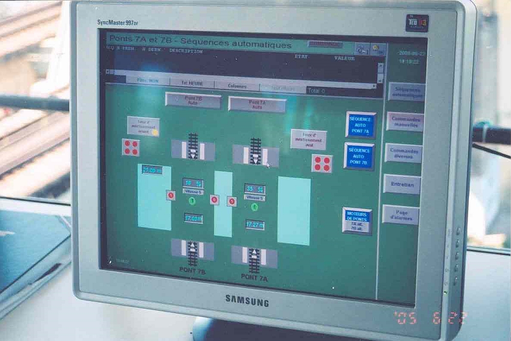 A control tower sits on the south shore next to the CPR bridges. From the control position, the field of vision is such that it allows the operator to observe as much railway traffic as marine traffic (see Photo 2). There is a control system for raising the lift spans of bridges 7A and 7B and another for interlocking and switching tracks in the Seaway Canal, Adirondack Junction,and Seaway Spur zones. Lift span operations are carried out using a computer console. System programming was developed and is maintained by the St. Lawrence Seaway Management Corporation (SLSMC) (see Photo 3). Track interlocking and switching is done using switches on a mimic panel supplied and maintained by CPR (see Photo 4). Marine and railway systems must meet specific traffic conditions to allow the passage of either a vessel or a train. These two systems are interdependent in order to limit traffic to one mode of transport at a time.