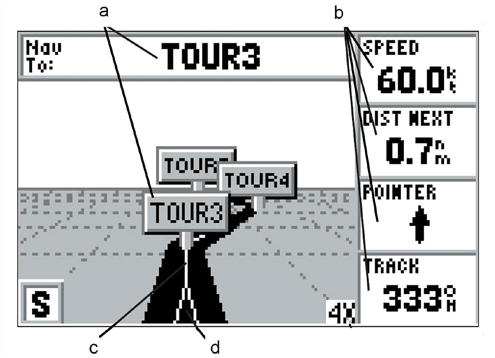 To help navigate, this type of GPS offers two graphic displays, known as "pages". The "compass page" indicates, for example, the route to take from one WP to the next or from any other position to a particular WP. The "highway page" offers a graphic display of a public waterway with an icon representing the vessel (see Figure 2). The GPS indicates the vessel's position (icon) relative to the planned route (path). In other words, it indicates whether the operator should maintain or alter course in order to move towards the path to be taken.