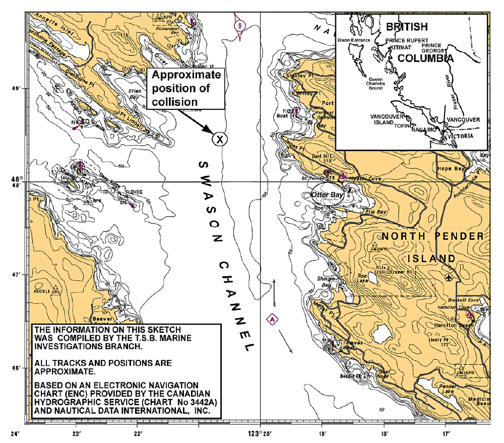 Tidal streams in Swanson Channel are found in the Canadian Tide and Current Tables, Volume 5, and are referenced on Race Passage. They flood in a northwesterly direction and ebb to the southwest. The collision occurred approximately one hour before slack water ebb, at which time the current would have been negligible.