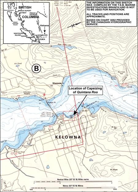At about 2250 on 08 June 2005, in good weather conditions, the rented pleasure craft Quintana Roo cast off from the public wharf at Kelowna, British Columbia, with a total of 61 persons on board: 55 on the upper deck, and 6 inside the lower accommodation area. Minutes after leaving its berth, the vessel listed to port and rapidly capsized. Many persons jumped or fell off and some, together with members of the public, helped to rescue those trapped inside. Some suffered minor injuries, and one person succumbed later, in hospital.