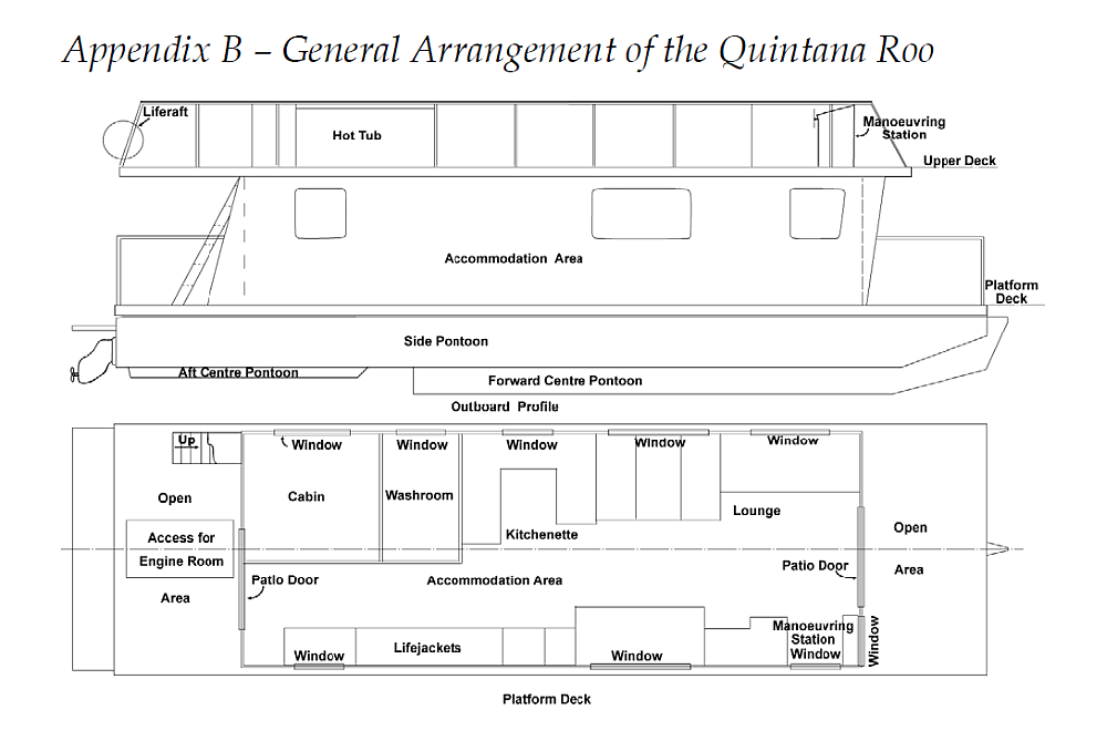 The Quintana Roo was designed and built in 1983 as a houseboat and was registered as a pleasure craft. The original design consisted of a flat, rectangular aluminium platform mounted atop two side pontoons. An additional centreline pontoon at the stern housed the engine, and the fuel, freshwater, and sewage tanks. A wooden superstructure forming the accommodation area was bolted atop the aluminium platform.