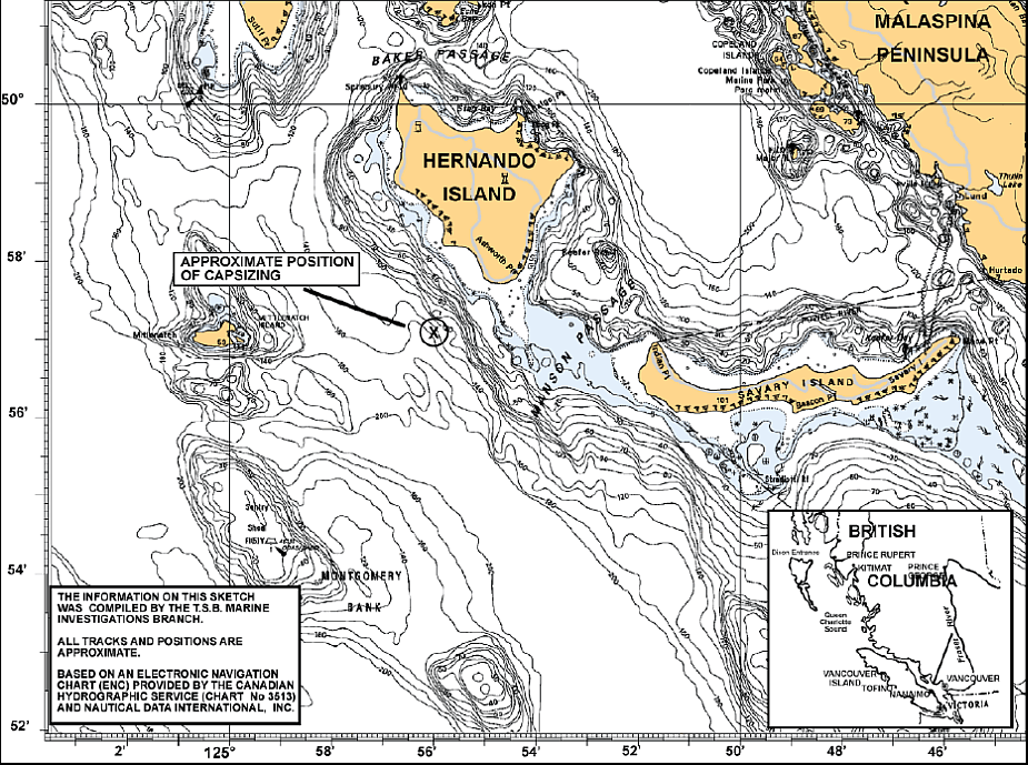 That afternoon, while transiting the Strait of Georgia, the skipper was alone in the wheelhouse and the other three crew members rested in the crew's quarters. The vessel was on a southerly course travelling at approximately 6.5 knots. Steering was by autopilot and both paravane stabilizers were deployed. The Morning Sunrise was in the vicinity of Savary Island when, within a period of approximately 15 seconds, it developed a list estimated to be 40° to port. The wind was from the southeast at 22 knots, and the vessel was pitching gently in 1 m seas and swell.
