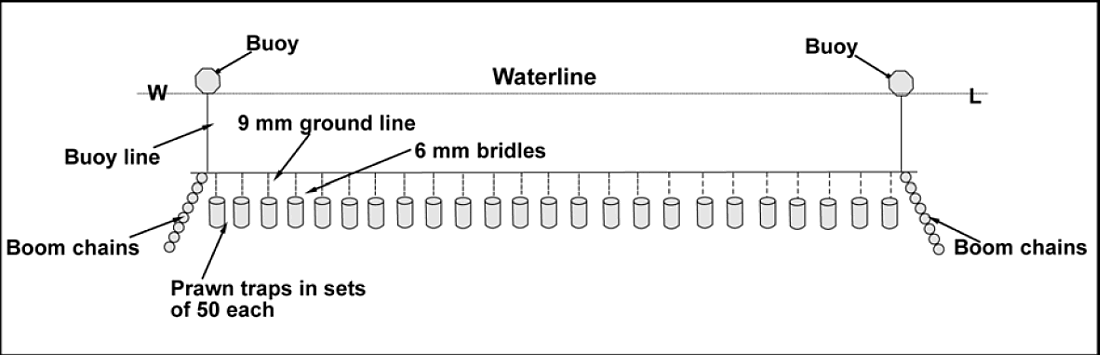 Traps are set in groups of 50 as shown in Figure 2. They are hooked onto a 9 mm ground line. The ends of the lines are buoyed to mark them on the surface and have boom chains, weighing approximately 34 kg each, to hold the traps close to the seabed. The traps are suspended from the ground line by 6 mm rope bridles. Five hundred traps would normally require 50 coils of 9 mm rope, with each coil having approximately 550 m of rope, each weighing about 20.4 kg.