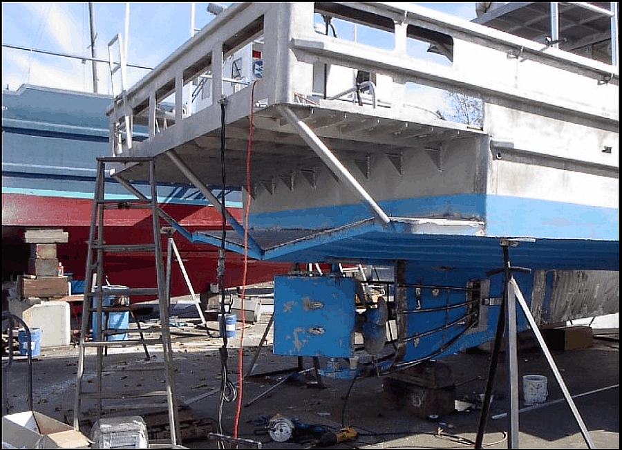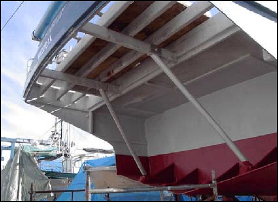 A similar aluminum platform extended approximately 2.75 m aft, from the top deck of the housework. This was used to store various fishing equipment and a tote that was temporarily used to store prawns before freezing.