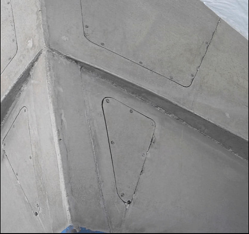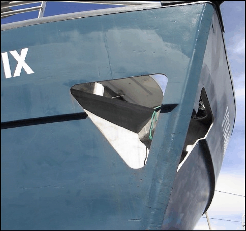 Photo 5a and photo 5b - Examples of vessels' overall length being reduced by opening the end compartment to the sea. This can compromise the watertight integrity of those vessels. These modifications are done to meet the DFO length restrictions. Note: Openings made in the bow section of the vessel on the photo to the left. Drain holes at the bottom of the triangular plate on the photo to the right.