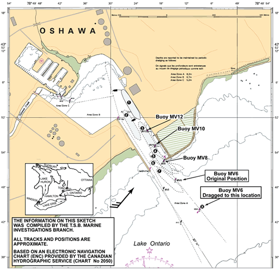 At 0732 Eastern daylight time on 13 October 2006, the bulk carrier Seneca, with a pilot aboard and assisted by the tugs Jerry G and Escorte, attempted to depart Oshawa Harbour in a strong breeze/near gale, whereupon it ran over two navigation buoys before making bottom contact and striking the eastern seawall at the harbour entrance.