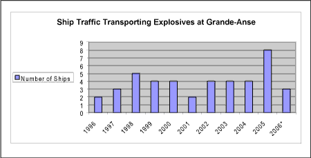 Since 1996, the terminal, which has the largest allowable limits for the in transit storage of explosives in CanadaFootnote 4, has seen a five-fold increase in explosives traffic (see Appendix C).