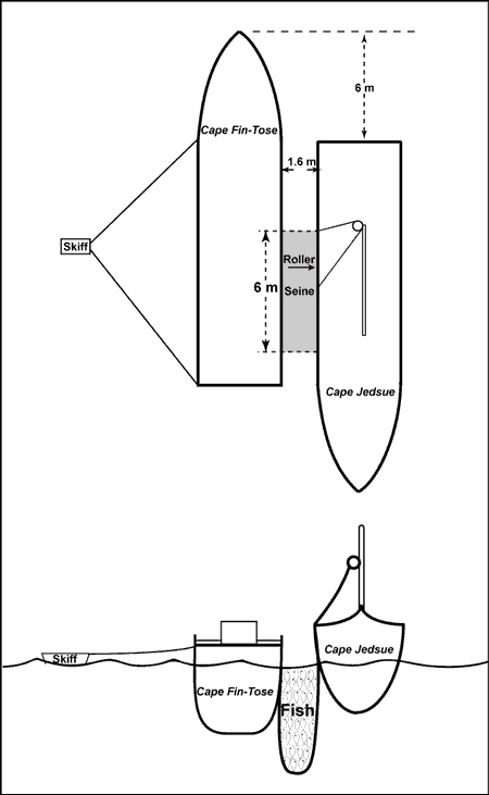 Due to a mechanical failure aboard the Cape Jedsue, only the Cape Fin-Tose was able to harvest the mackerel. This resulted in a large set of fish being tightly pursed in the seine for several hours. Unable to swim, the mackerel started to die and, as they sank, their combined weight acting against the bottom of the net increased the loading on the net. This loading transferred to the seine head line lashed to the Cape Fin-Tose's starboard bulwark and to the Cape Jedsue's net roller on the main deck's starboard bulwark. This produced a large heeling moment on both vessels, but because the Cape Jedsue had not started loading, this vessel had sufficient stability and reserve freeboard that the effect was far less pronounced.