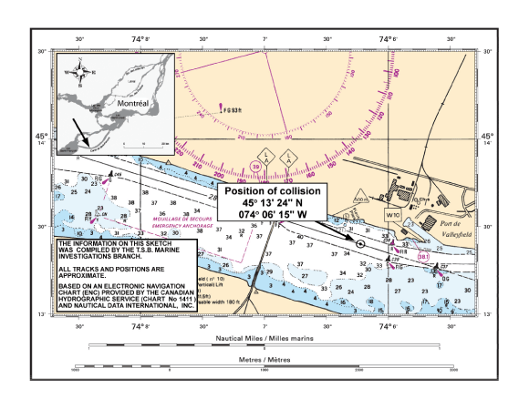 As the stand-on vessel, it was the Capt. Henry Jackman's responsibility to determine both the meeting point and the passing arrangement. At 0400, some 30 minutes before the collision, the first officer (1/O) of the Québecois called the Capt. Henry Jackman to make meeting arrangements and agreed to slow his vessel in order to meet below the Valleyfield Bridge. The 1/O on the Capt. Henry Jackman agreed, but the exact location of the meet was not specified. The vessels met just 1.5 ship lengths outside the caution area below Valleyfield Bridge. This location, although not a no-meeting area, was still less-than-ideal given the relatively narrow channel width, the prevailing currents, and the limited distance available to properly line up for the bridge.