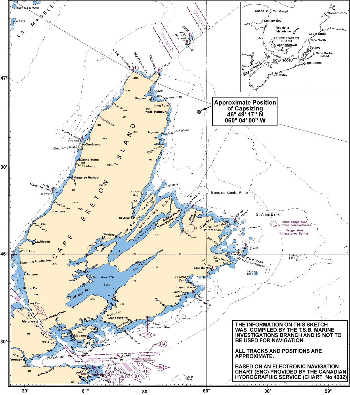 - The route being followed at the time of the occurrence was approximately 103° or east by south with winds from the north by east at 10-15 knots. The known current sets to the south-southeast in this area of Cabot Strait at a speed varying from 0.5 to one knot. Therefore, the resulting current and wind would have caused the vessels to drift to starboard (and not to port) while steering on the course they were on. Furthermore, set and drift calculations based on the CCGS Sir William Alexander's immediate post-capsizing position determined a set and drift to the southeast at approximately 0.5 to one knot.