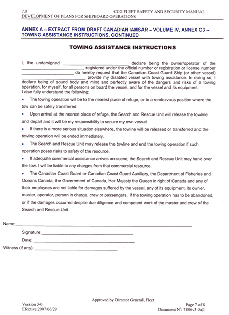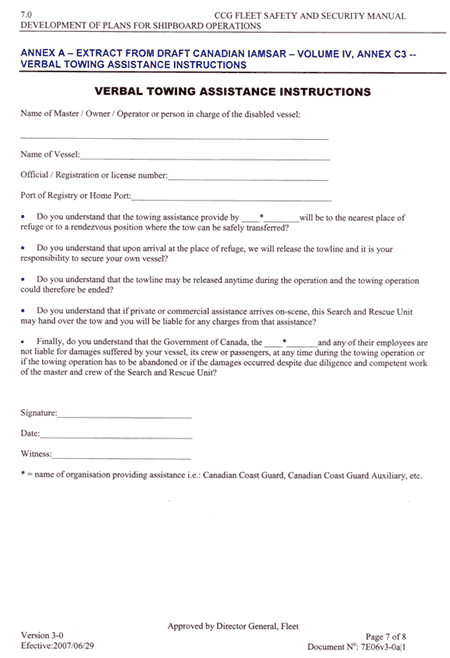 The disabled vessel must agree to a set of routinely administered instructions prior to towing assistance being provided. This document, titled Towing Assistance Instructions (see Appendices C and D), is either read and signed by the vessel in question, or agreed to verbally via VHF radiotelephone. The Towing Assistance Instructions is effectively a waiver meant to absolve the Government of Canada (and any of its agencies and employees) from any liabilities suffered while towing. This document does not, however, stress or otherwise indicate the inherent risks and precautionsFootnote 21 to be taken while being towed by another vessel in either open or ice-infested waters.