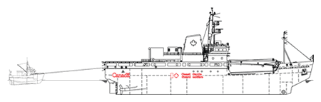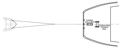 On the CCGS Sir William Alexander, the towing hawser was led through the aft centerline fairlead and secured around the towing bollard. This arrangement resulted in a stern-to-stem towing distance of about 22 m.