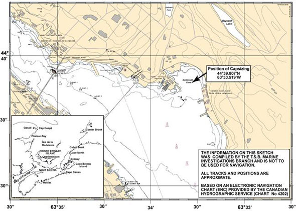 Three crew members immediately surfaced, followed by the other five persons, who had been briefly trapped in the pilot house. A CCG officer on board the CCG cutter Sambro, which was docked nearby, noticed the capsized vessel and notified Halifax Marine Communications and Traffic Services (MCTS). The officer then took charge of a fast-rescue craft tied up at the CCG base and, with the assistance of several shore-based personnel, recovered all eight people from the water.