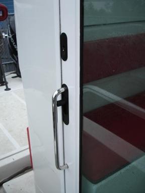 The two pilot house doors could be opened from the outside. They could also be opened from the inside via a flush-mounted door latch. To operate the latch, a user was required to place one or more fingers in a slot measuring 19 mm by 55 mm and push down (see photo 4 and photo 5). The starboard door, however, had been installed upside down; its latch therefore worked in the opposite direction—to open it, the user had to apply pressure upward. In addition, the lock for each door was adjacent to the finger slot. The lock switch was a left/right toggle requiring little effort to manipulate.Footnote 11 Once the lock switch was engaged, there was no sign or other visible indication that the door was locked.