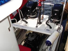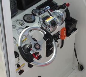 All functions of the vessel, with the exception of the aft fire monitor, are controlled from inside the pilot house. The vessel is fitted with three gasoline engines: a pair of 250 horsepower (HP) outboards and a 315 HP inboard. The outboards are used for manoeuvring. The inboard can power the two fire monitors or the jet drive.