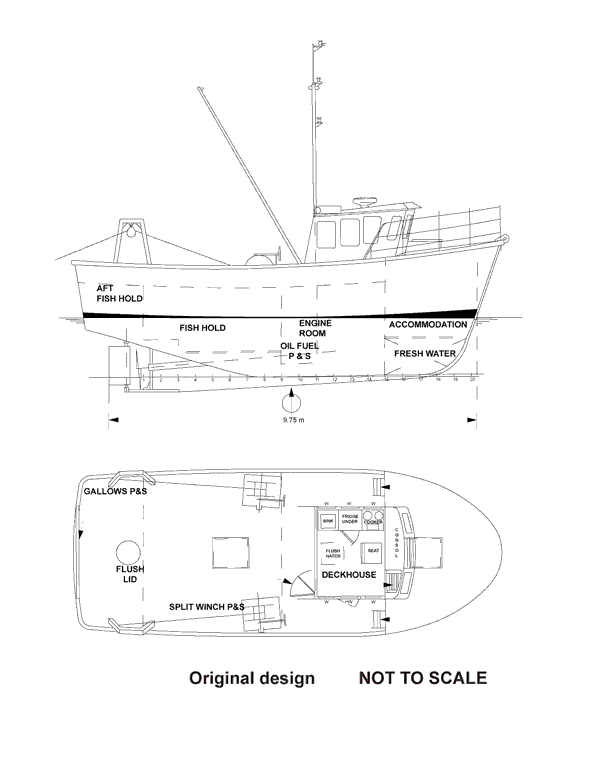 Further changes to the original design included widening the deckhouse by 1.5 m, raising the boom location, and changing the rigging to an A-frame style.