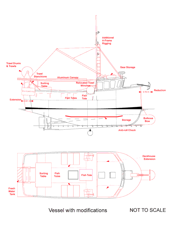 The vessel had undergone several modifications, including some to meet the Department of Fisheries and Oceans (DFO) licence length restrictions, and others to accommodate multiple fisheries. For example, among other changes, the addition of a second trawl drum above the original, combined with the removal of 0.76 m from the bow and the addition of 0.61 m to the stern, changed the vessel's original waterplane area and displacement. Combined with the stowage of fish in totes on deck, as opposed to in the holds, these changesFootnote 19 likely resulted in a raised centre of gravity.