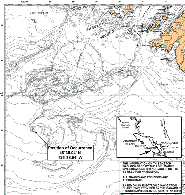 On 03 September 2008, the unexplained port list continued to increase, despite the even distribution of approximately 800 kg catch (plus ice) in totes on deck. To compensate, seawater was pumped into the starboard fish hold, again temporarily eliminating the port list. The vessel was anchored on Swiftsure Bank for the night, in the vicinity of other fishing vessels, in position 48°35.04′ N, 125°38.54′ W (see Appendix B—Area of the occurrence).