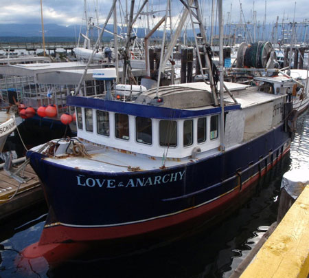 On the early morning of 04 September 2008, the small fishing vessel Love and Anarchy capsized and sank while anchored on Swiftsure Bank, 20 nautical miles southwest of Cape Beale, British Columbia. The owner and the crew member were rescued by another fishing vessel.