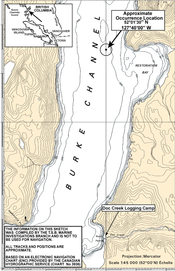 At 0913, the Canadian Coast Guard (CCG) fast rescue craft BB1 and the CCG Cutter Cape Farewell were tasked from the CCG base at Bella Bella, B.C. At 0924, a Buffalo 452 and Cormorant 906 from the Canadian Forces base at Comox, B.C., were tasked and departed at 0946 to assist in the search. Two private helicopters also assisted in the search, departing from Doc Creek and Bella Coola at 0929 and 0950, respectively.
