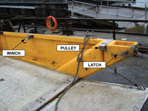 The bow ramp is hinged along the bottom edge (see Photo 2). The two winches, each with a capacity of 682 kg, were installed on either side of the vessel in 2007. They are used in conjunction with wires and steel pulleys to open and close the bow ramp, but are not designed to hold the door shut.