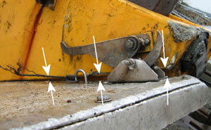 A latch on each side of the vessel was designed to keep the bow ramp secured when closed. Both latches were worn, the bearing surface of the latch hook having been polished smooth by wear. The hinge pin of the latch hook also had considerable freeplay within the bushing.