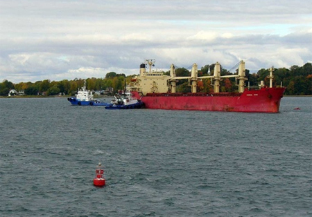 On 05 October 2009, the geared bulk carrier Federal Agno had completed loading at Côte-Sainte-Catherine, Quebec. The vessel was docked facing upbound and, in order to proceed downbound, was to turn around in the anchorage at the west end of Lac Saint-Louis, Quebec. While executing the subsequent starboard turn, the vessel grounded near buoy A52 at approximately 1945. The vessel was refloated three days later. There were no injuries or pollution.