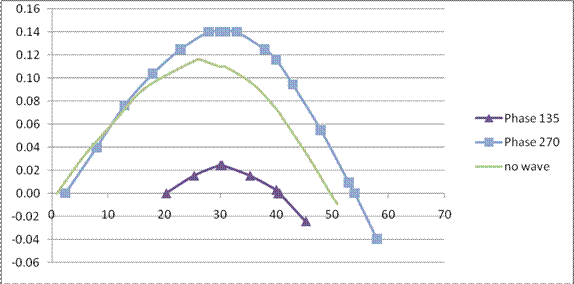 GZ curves were produced for various positions of a wave crest along the hull (see Figure 1). These assumed an average wave height of 0.9 m (3 ft) and a 45° angle of encounter (from the longitudinal axis after end). These were then compared against a condition where there were no waves. Results show that stability in waves was less than when no waves were present, except for a wave phase of 270°. At this phase, the righting lever amounts to 71% of the STAB 4 minimum, and the range of positive stability is 54°. The worst-case condition occurs at the wave phase 135°, wherein the area under the GZ curve represents just 6% of the STAB 4 minimum and the range of positive stability is only 20°. This corresponds to an angle of vanishing stability of 40° (see Appendix D - Graph 2).