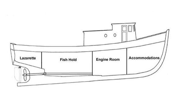 The working deck had a single raised hatch located on the centreline, providing access to the fish hold, as well as a single flush watertight hatch providing access to the lazarette. Four flush hatches on each side provided means to stow fish in the hold. The hold was subdivided into 5 pens fore and aft and 3 wide for a total of 15. A series of freeing ports in the bulwarks at deck level provided a means of clearing water off deck.