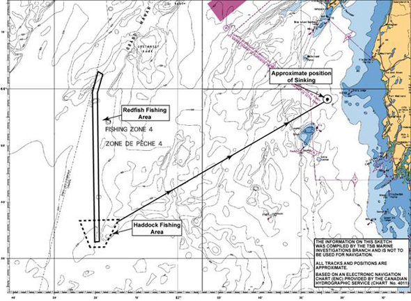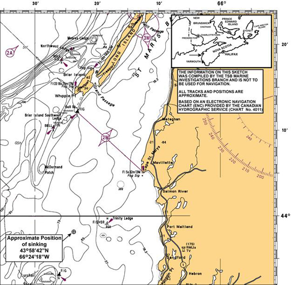 Within minutes of the abandonment, the vessel capsized and sank in position 43°58′42″N, 66°24′18″W (Appendix C).