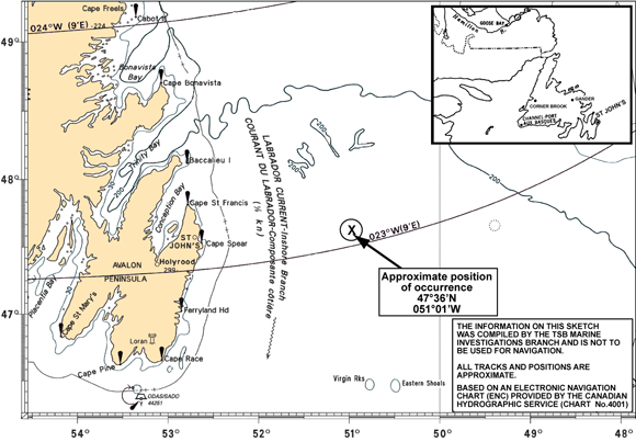 About 20 minutes after the vessel capsized, it sank in position 47°36′N, 051°01′W.