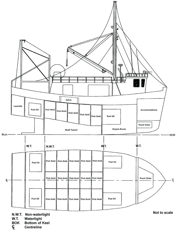 The vessel was powered by a marine diesel engine with a reverse/reduction gearbox driving a single fixed-pitch propeller and was fitted with a single plate centreline rudder. A propeller shaft packing gland designed to prevent the entry of water into the engine room was fitted in way of the bulkhead between the shaft tunnel and engine room; however, it was not unusual for the packing gland to leak. Four diesel tanks were arranged on the port and starboard sides of the engine room and the lazarette. A fresh water tank was located in the forepeak.