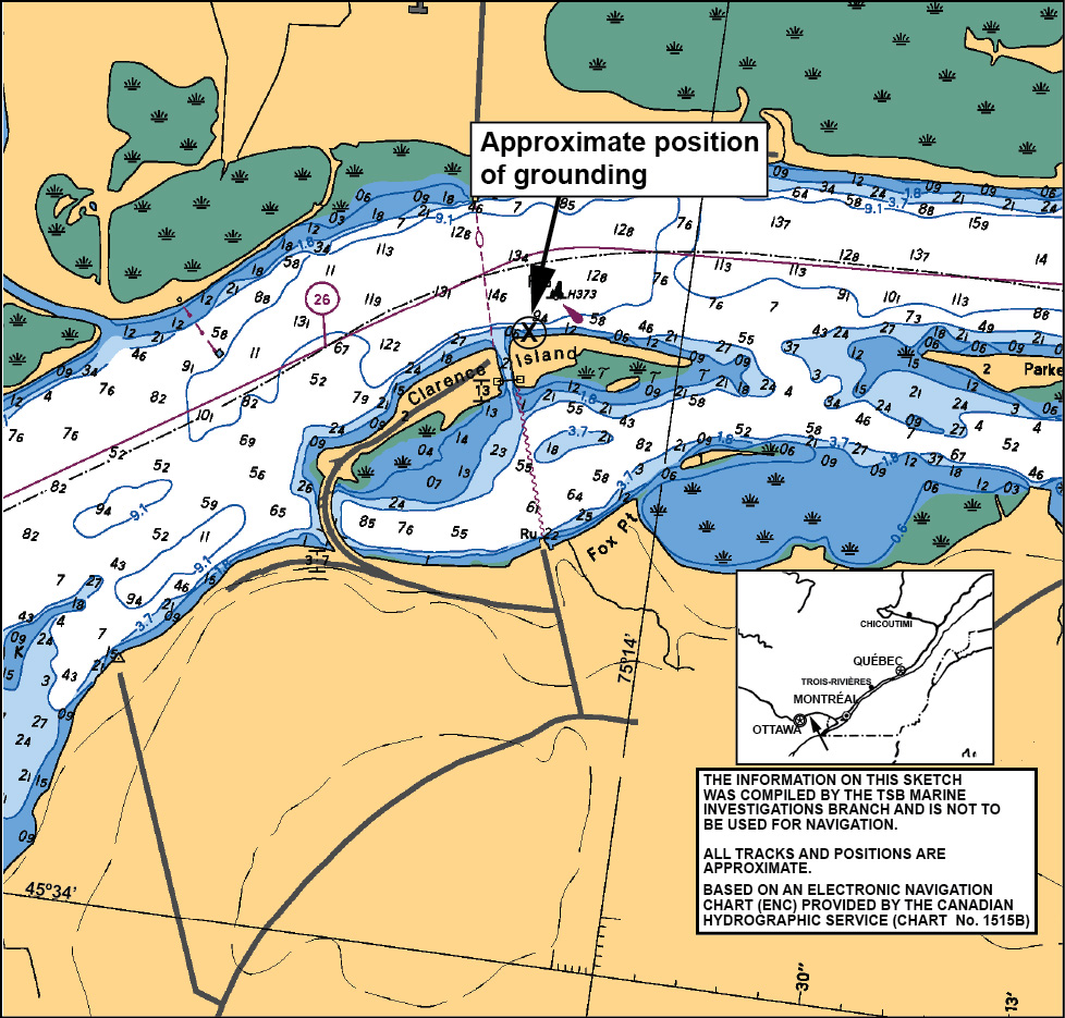 In this occurrence, there was no 9–1–1 call made, nor was MCTS alerted about the situation. The OPP was conducting a routine highway check and learned about the occurrence from the ferry operator's wife. The OPP advised the TSB and the Joint Rescue Co–ordination Centre at Trenton (JRCC). TC was not made aware of the grounding at the time of the incident, contrary to regulatory requirements.Footnote 20