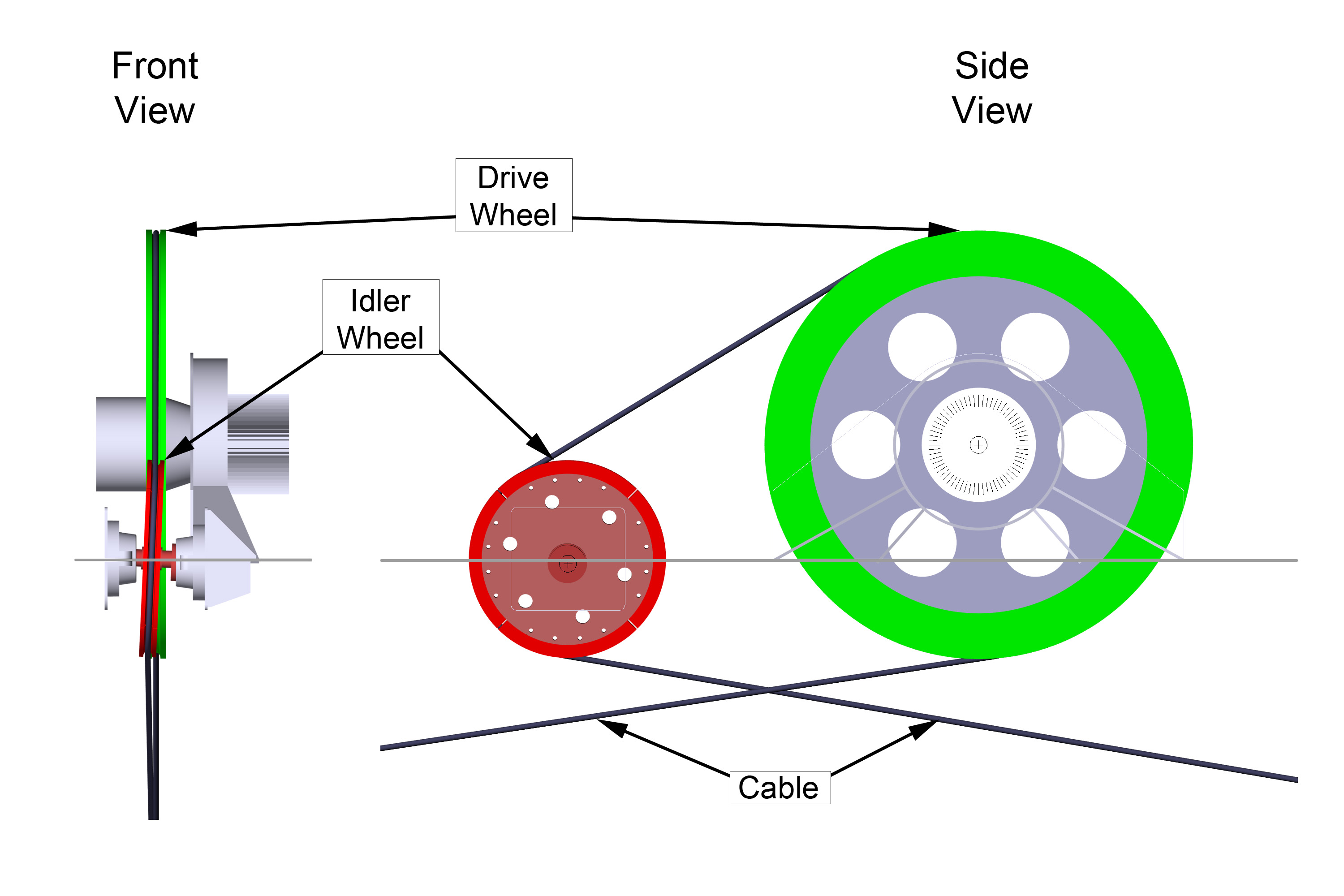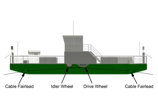 The symmetrical cable drive assemblies are housed on either side of the ferry inside deck superstructures. Each drive assembly consists of an electric drive motor, a 1.9 m diameter electric drive wheel and a 0.86 m diameter idler wheel. Because the vessel travels back and forth only along its cables, the sides of the vessel, its equipment and associated drive systems are referred to as the east and west side, and the ends of the vessel are called the north and south end.