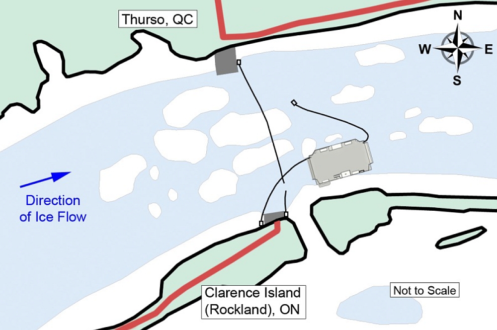 The vessel was built in 1974 as the Howe Islander and was operated by the Ministry of Transportation of Ontario as the Howe Island cable ferry until 2004 when it was purchased by the current owner. The Howe Islander operated in the St. Lawrence River from Howe Island, Ontario (east of Kingston), to the mainland. The crossing distance of 425 m was comparable to the Ecolos ferry crossing of 487 m. The ferry operated year-round through a track in the land-fast ice that was kept open by employing a bubbler system.Footnote 2 The ferry would temporarily cease operation when ice pans were flowing downriver in the early winter and during the spring break-up. The Howe Islander 2.9 cm (1 1⁄8 inch) cables were comparable to the Ecolos 2.54 cm (one inch) cables that were in use at the time of the occurrence.