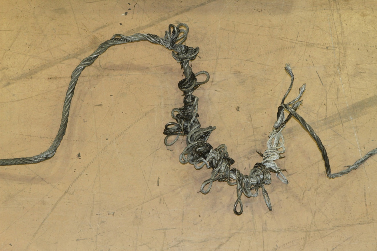 which is consistent with failure under high tensile stress. Little wear or corrosion was observed on this cable.