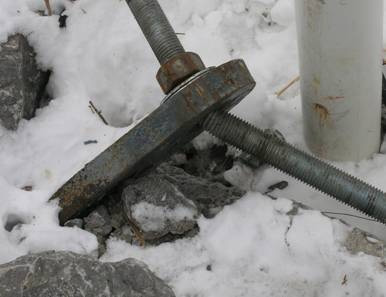 Field examination of the west cable's south shore attachment (at Clarence Island) showed that it had also experienced high tensile loads. The threaded shore attachment rod was bent and the attachment plate, fabricated from thick plate material, had been plastically deformed toward the river.