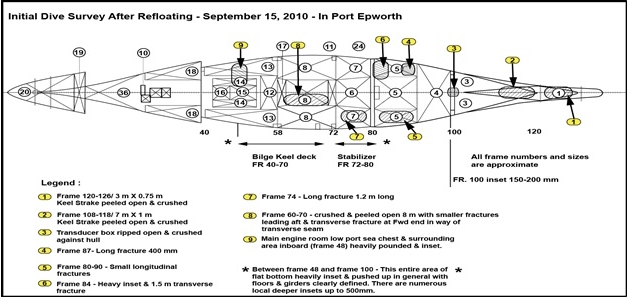On 01 September 2010, a dive team and a salvage company, engaged by the ship management company to refloat the Clipper Adventurer,arrived on site. The dive team discovered that the hull had sustained extensive damage from the forepeak to aft of amidships and that 13 double–bottom tanks and compartments including 4 full diesel oil tanks were holed, as opposed to the 7 originally reported by the crew.