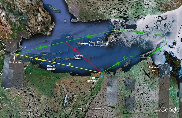 An alternative route (C) was available using the vessel's reciprocal track northeast back to the main east/west surveyed channel. It was not chosen by the bridge team due to the extra distance of 200 miles. The vessel was scheduled to arrive in Kugluktuk at 0800 on 28 August 2010. This arrival time could have been achieved by either the chosen route (A), 90 nm to Kugluktuk at a speed of 6 knots, or by the longer route (C), 200 nm at a speed of 13 knots. Either route would have allowed the vessel to reach Kugluktuk on schedule.