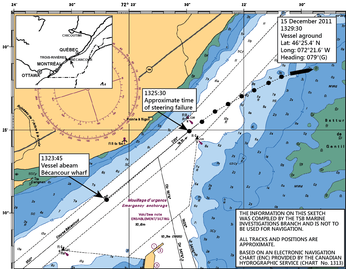 At 1327, the pilot reported to MCTS that the vessel was leaving the channel and would soon ground. At approximately 1328, the master came on the bridge. He went directly to the steering stand and transferred the steering system actuator switch from port to starboard, restoring control to the steering. Nonetheless, at 1329, as the bosun and OOW were out on deck on their way to attend the anchors, the vessel ran aground at an estimated speed of 8 knots SOG. At 1331, the pilot called MCTS to report that the vessel was aground in position 46°25.4′ N and 072°21.6′ W with a heading of 079°.