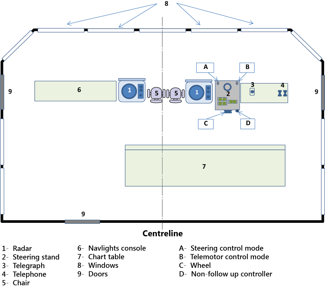 The Orsula is a bulk carrier cargo vessel built of steel, with machinery spaces and accommodations located aft. The 6 cargo holds and hatches are serviced by three 30-tonne electrical-hydraulic cranes mounted on the centreline of the vessel. The bridge is equipped with all the required navigational equipment, including both 3-cm and 10-cm radars distributed on either side of the centreline (Figure 1). The steering stand is situated off to the starboard side of the centreline of the bridge, and an indication is in place at the starboard window to enable visual alignment with the steering light. The engine controls and the communication system are located on the starboard console.