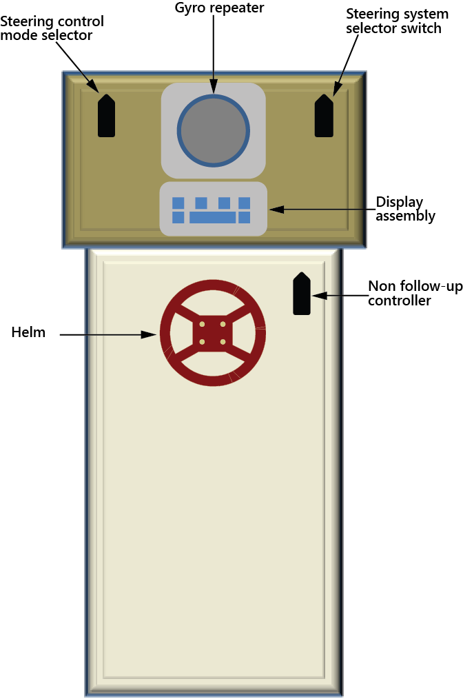 A steering control mode selector switch, located on the upper left-hand side of the steering stand, is used to select 1 of 3 different means of steering the vessel: autopilot, hand or non-follow-up (NFU). When the steering mode selector switch is set to the “hand”