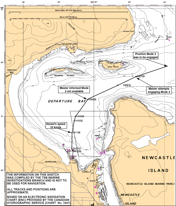 As the Queen of Coquitlam approaches Departure Bay, the procedures in the VSM require that the vessel switch from Mode 1 to Mode 2 for arrival and docking. The procedure detailing pre-arrival checks Footnote 7 specifies that Mode 2 is to be engaged when abeam of the Horswell Buoy. The master did not attempt to engage Mode 2 until abeam of Jesse Island, which is 0.5 nm west of the Horswell Buoy and closer to the berth. Furthermore, the bridge crew did not notice that Mode 2 had not engaged until the vessel was inside Departure Bay, 0.9 nm west of Horswell Buoy. By not attempting to engage Mode 2 at the location specified in the VSM, the master had a reduced amount of time to assess the situation and take corrective action.