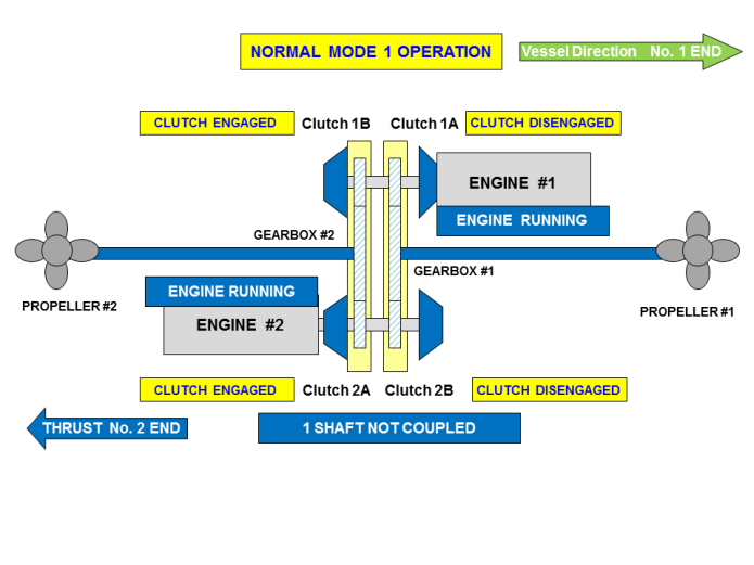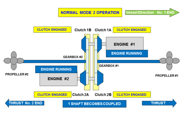 This mode is primarily used during docking and undocking. In this mode, if both engines are in use, all 4 clutches are engaged and provide power to both propellers (Figure 2). It takes approximately 90 seconds to engage Mode 2, as the bow propeller cycles from feathered to a pitch setting that allows the clutches to engage.