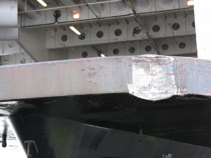 The damage to the vessel was confined to the No. 1 end port bow rubbing strake (Photo 2). The damage between frames 90 and 96 was approximately 7.0 m in length and up to 1.0 m in depth. This resulted in a breach of the hull into the No. 1 end rudder compartment. The plating of the superstructure adjacent to this area was also buckled.
